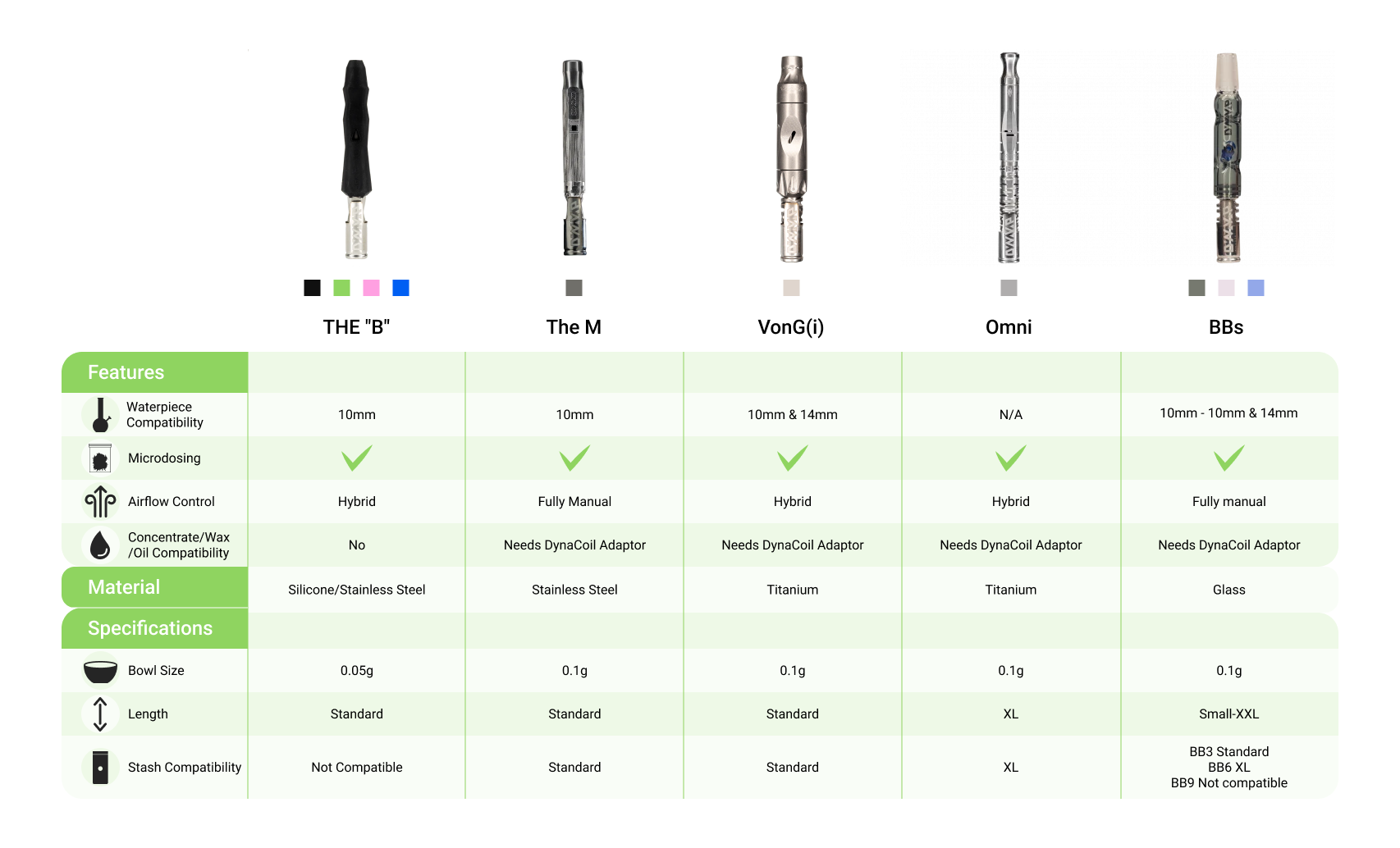 All of our M and B devices come with a snap stash, while the Omni and VonG(i) devices come with a wooden DynaStash. Our devices have interchangeable parts, so you can mix and match tips and stems. While different models may require additional or fewer components, the core parts of every DynaVap device remain consistent.